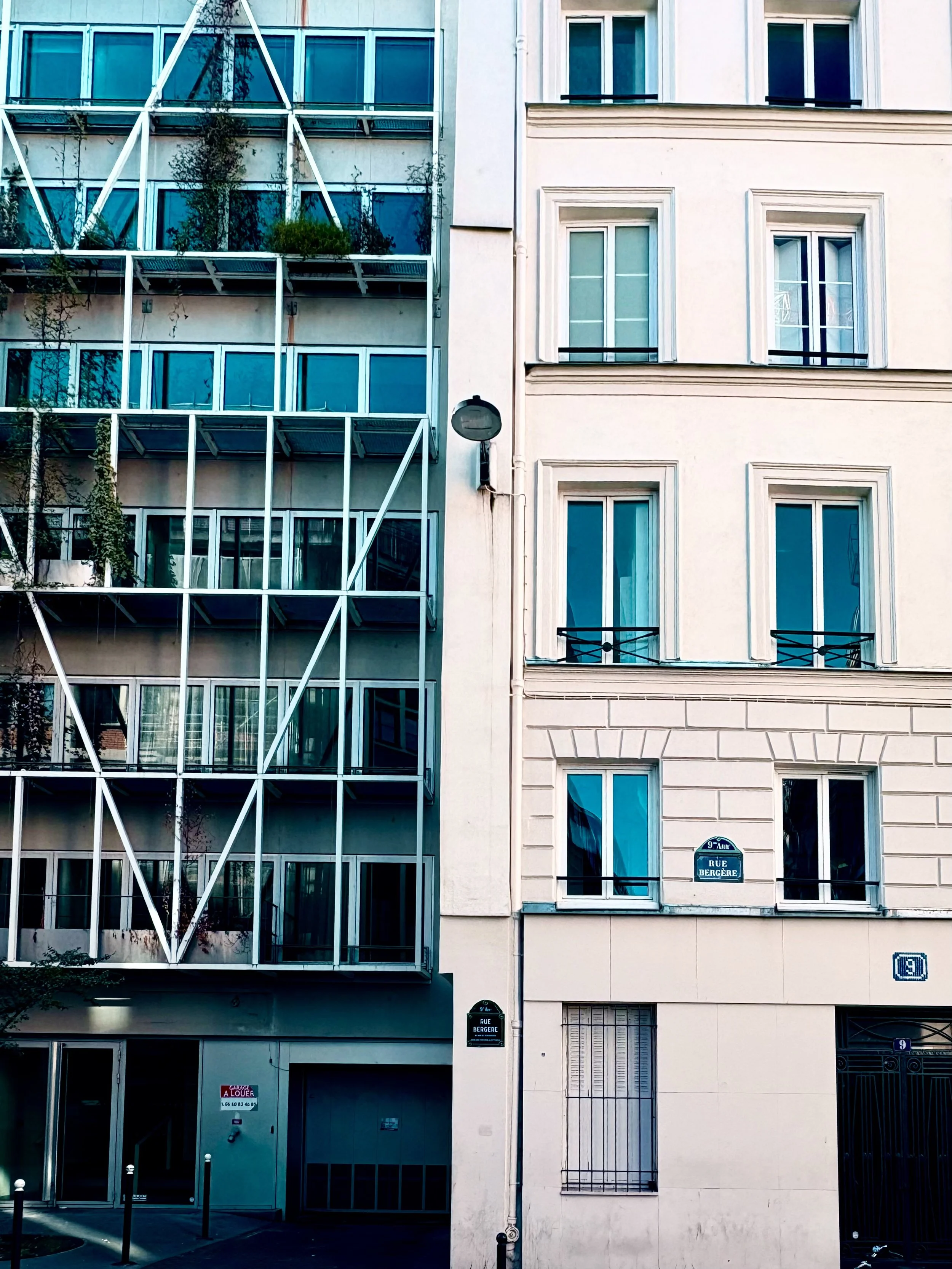 Newer parkade (left) and heritage residential (right) sit side by side in a Paris street.