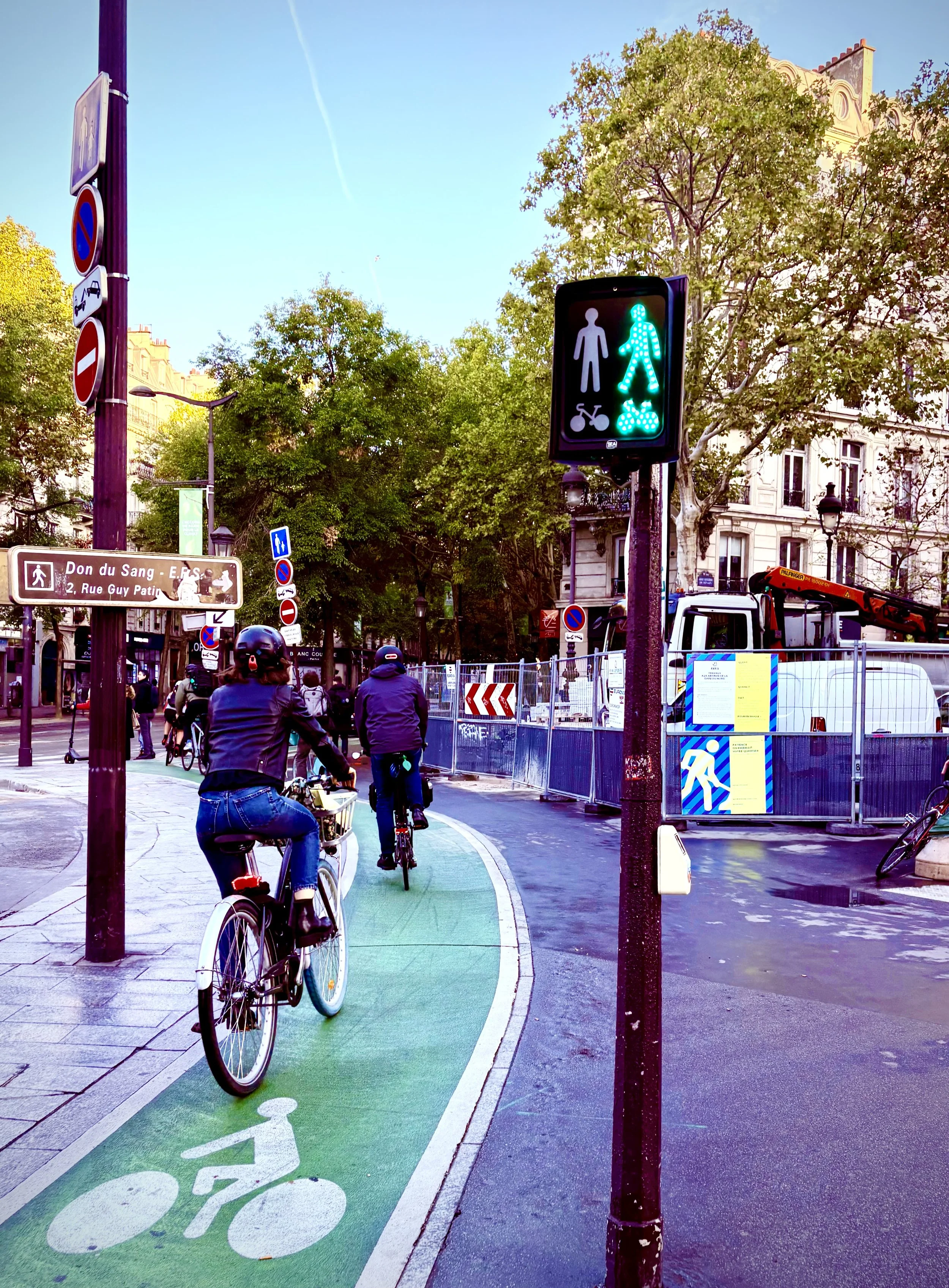 Paris’s newer emphasis on pedestrians and cyclists really stood out for me. Never-before-seen dual signage, distinct paving treatments, and plenty of mutual respect for these two modes of transportation. The coexistence of feet and wheels—each acknowledged as legitimate—suggests a city that’s learning from past tensions. Instead of competition for space, there’s some choreography between priority modes of getting around. Paris smells better. And I feel safer making my way about.