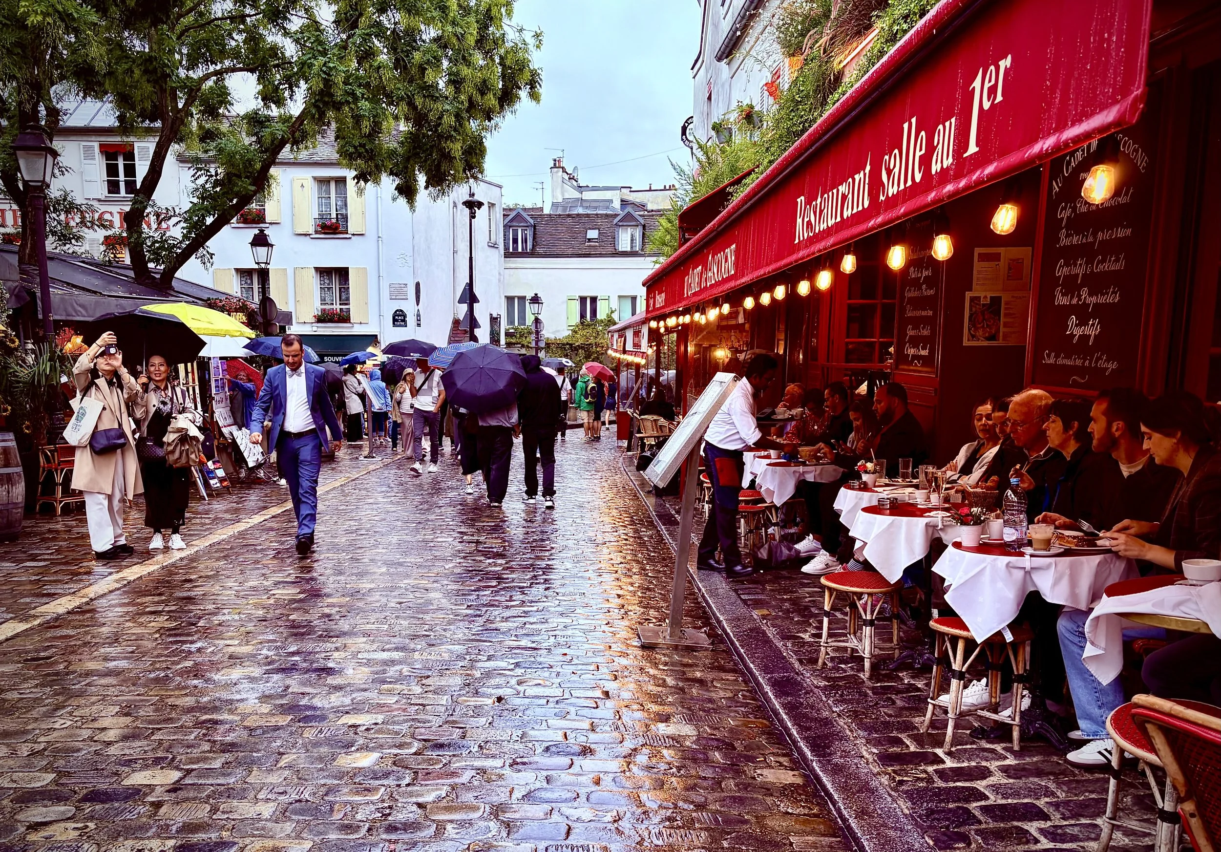 Even on a rainy day, cafe culture is still hopping in Paris.