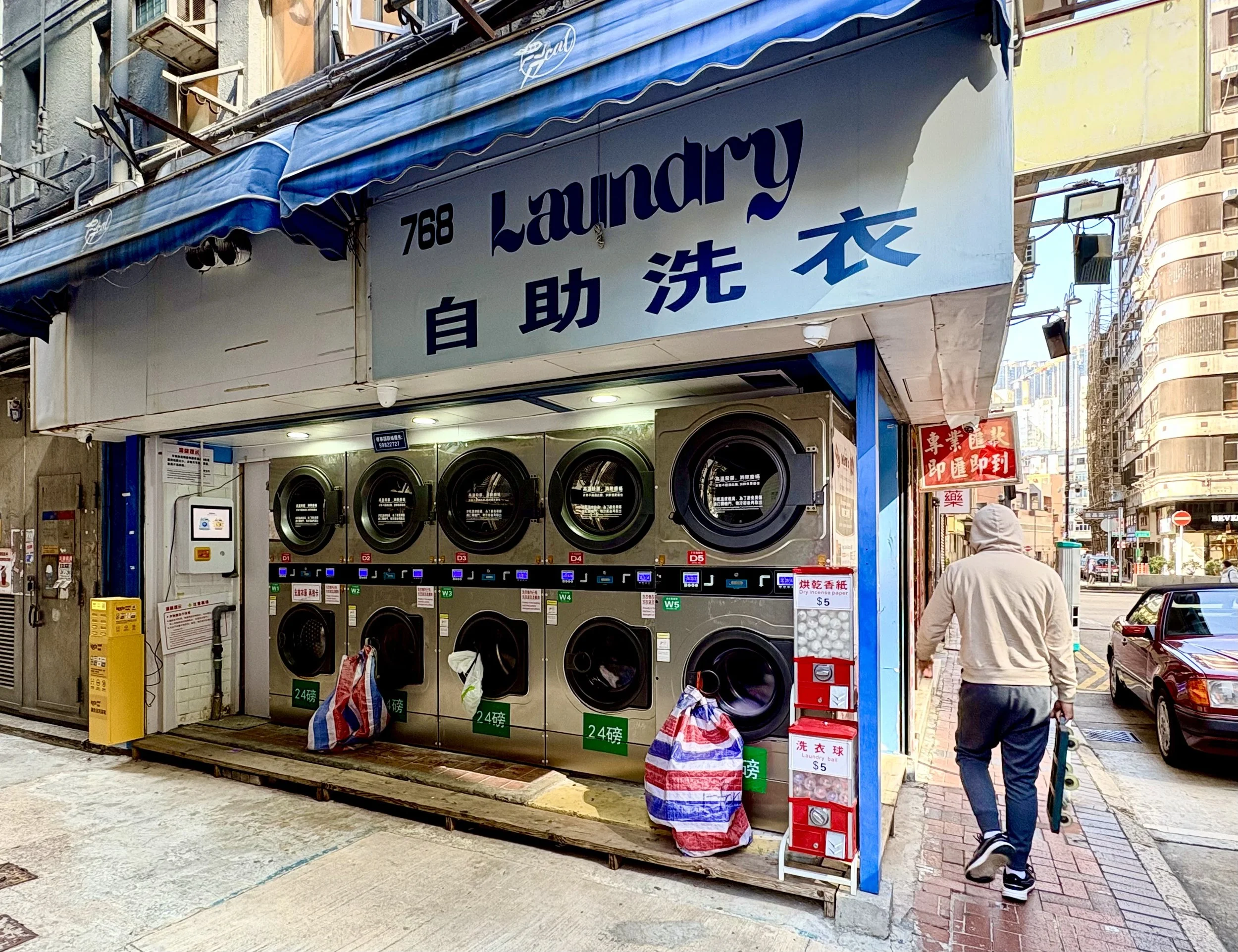 Washing machines open directly onto sidewalks. Vending machines dispense beauty products from entire wall-length installations. Streetfront retail here meets daily needs by folding commerce into the ordinary rhythm of the street. The city sells what you need, where you are, without ceremony.